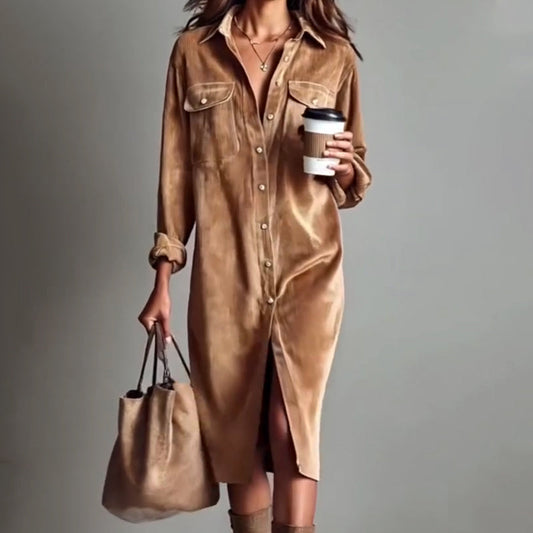 Lässiges, lockeres Kleid mit Leder-Patchwork und Taschen für Damen