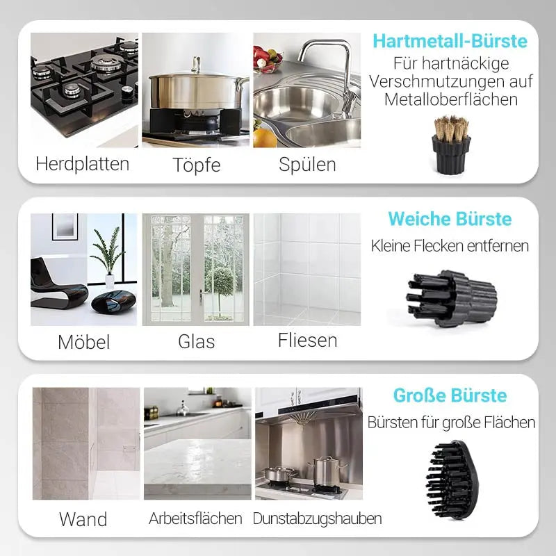 Der Hochtemperaturdampf (155°C) durchdringt und löst hartnäckige Fett, Schmutz und Flecken sofort – keine mühsamen Scrubb-Aktionen mehr! Perfekt für Küchentheken, Herde, Backöfen und Badezimmerfliesen.