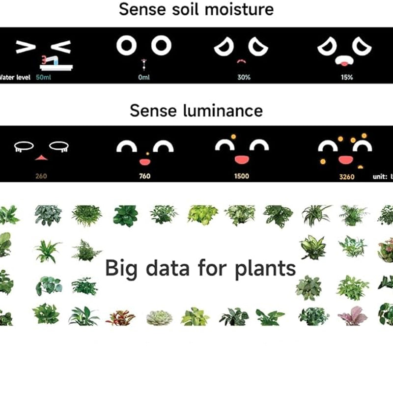 PLANT CONDITION MONITORING: Ambient sound monitoring, sensing light; Plant Database: built-in multiple plant care strategies. Given a professional watering, light, and temperature control program.